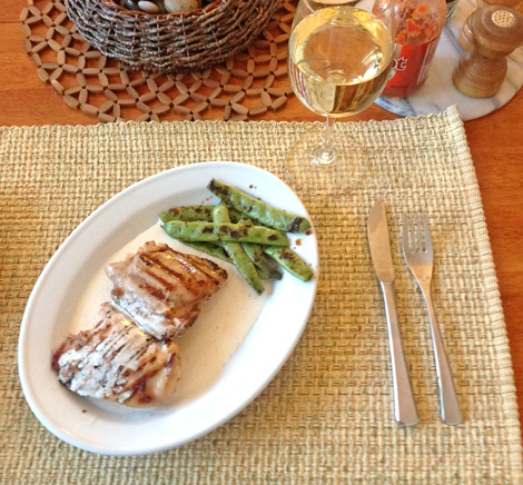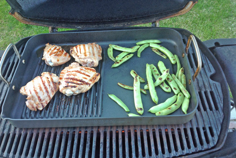 For the chicken, I hit my “to cook” files on the computer, looking for some kind of grilled chicken. As previously noted, we have a rekindled love affair with our grill, and this has been exaggerated by a housewarming gift from Carol’s brother Mark and Jannie of Keystone Tomato and Big Green Egg fame: a Technique Grill Pan.