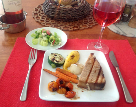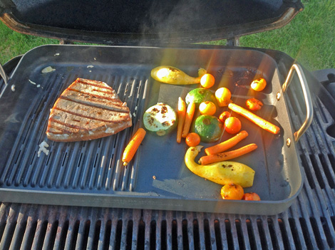 Wow. That sucker sits on your grill and on one side imitates the grill and on the other presents a griddle. And it’s non-freakin’-stick!! Swordfish has a good chance of sticking on your grill, right?