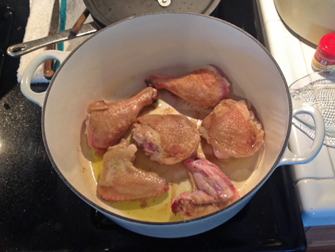 I used the leg, thigh and wings for my stew. Here they are, browning.