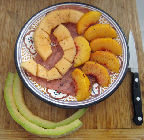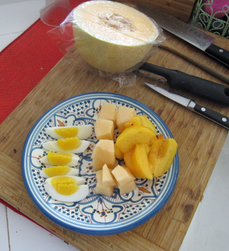 Ambrosia melon, “yellow” watermelon, and peach for breakfast…