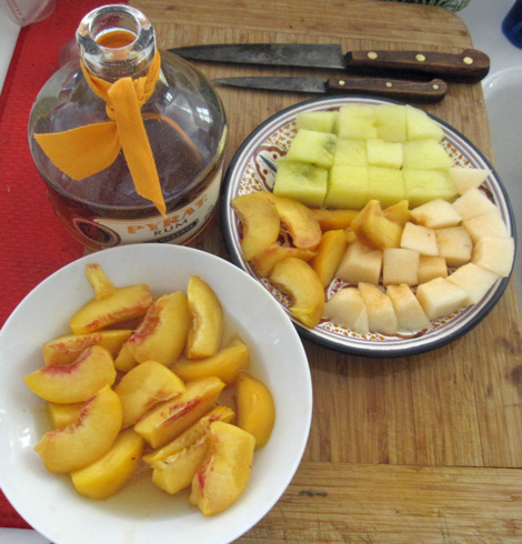My peaches went beyond ripe, so I had to peel two at once. Turns out that’s not such a bad thing. Sadly, the “yellow” watermelon had almost no flavor (the rum-soaked peaches had lots of flavor).