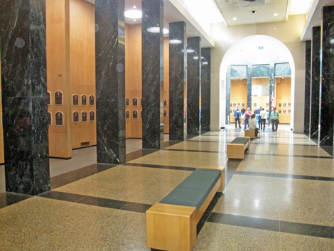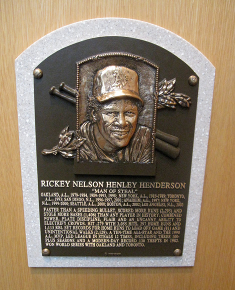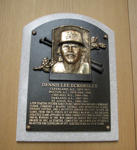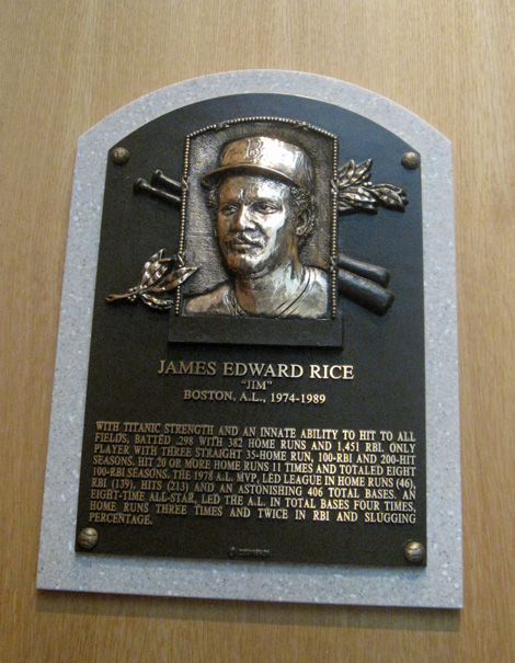 Perusing the hall of plaques on the first floor, it took a while to become acclimated. The plaques are grouped by when the player was elected, not when he played. I wanted to take a picture of those that I admired and saw in person, so I gravitated to the later years and found Rickey Henderson (1979-2003) and Jim Ed Rice (1974-1989) in the 2009 nook. Also in that nook was Joe Gordon, who played for the Yankees 1938-1950. I found Dennis Eckersley (1975-1997) — another of my faves — in the 2004 group. I didn’t find Yaz (1961-1983) because I couldn’t remember just when he retired or might have been elected. It would have been nice to have a directory somewhere.