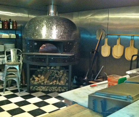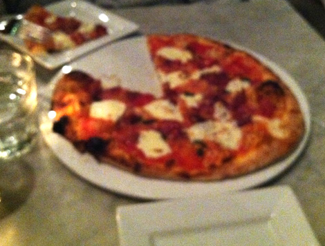 When dinnertime came, we drove back towards town to Bocca Osteria. The place was crowded and a nice buzz of happy people hung over the room. The only table left on this Friday evening was a high metal table with metal stools — the kind we usually try to avoid — but these were surprisingly comfortable. We split the “Carne” thin crust pizza from the wood fired oven… basically a Margherita with chopped meat. Damn good.