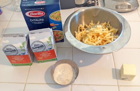Dis is good and EZ. Made a half-pound of ditalini pasta with 2 cups of cheese sauce, so I’ve got 4 cups of cheese sauce in the fridge/freezer. Used supermarket cheeses. Ground the cheeses in the Kitchen Aid grinder attachment. That is EZ, ‘cept for the clean-up, but still… Served with baby back ribs and a first course of Cook’s Illustrated Cream of Tomato soup. Plenty LO for lunches. Now I’ll have it at Tipsy Pig, see how mine stood up. [Mine stood up well.]