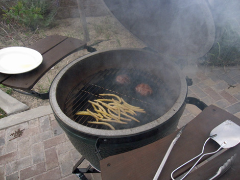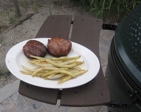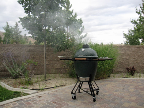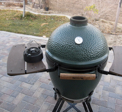 Set up the EGG for indirect grilling with platesetter – legs up – and porcelain grid.
