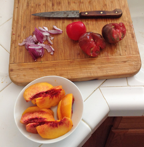 When I saw her put the water on to boil, I started thinking about the salad. We both like what we call Israeli Salad, which is basically chopped vegetables. The true Israeli Salad (or Arab salad) has a base of tomatoes and cucumbers, but I make it with whatever — and tomatoes and cucumbers aren’t exactly in season (there’s six inches of snow out the window).