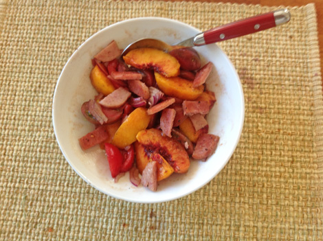 Salad out of the fridge. I like salad for breakfast, but not cold salad. I dumped it on a plate and put in the countertop convection oven for a while at 150°F while I fried some cubes of Spam (I chopped one slice, about 1/2 ounce). Added the Spam to the salad plate and fried a flat egg to go over.