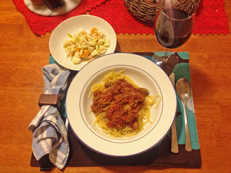 I tossed those with Newman’s Own salad dressing and there you have it. (OK, I coulda shoulda made my own dressing, but I did the whole salad while the spaghetti was cooking. Besides, I like Newman’s.)