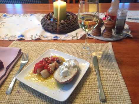 I didn’t take a picture of the plate, but it looked great! Three big shrimp over greens, with Rosemary Garlic Potato Gratin alongside.