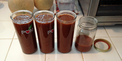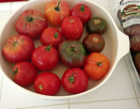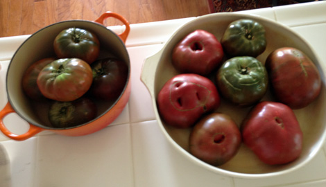 That was on my mind when shopping at the Farmer’s Market. The heirloom tomatoes didn’t look very good, but I got enough of those and some Early Girls to maybe make a test sauce. It turns out a couple of the heirlooms went bad by Monday and I was a bit shy of a full dish, so I went out and got a sleeve of Kumato at Scolari’s. (Eric introduced us to this amazing hybrid tomato on his recent visit.)