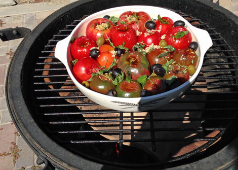 When the fire is ready, throw in the soaked barrel stave, place the Platesetter in the EGG, legs up and place the porcelain rack on the Platesetter legs. Put your roasting dish of tomatoes and stuff on the rack. Close the EGG and open all vents. Bring to a temperature of 400°F and roast until the tomatoes are soft, and collapsing, about 40 minutes.